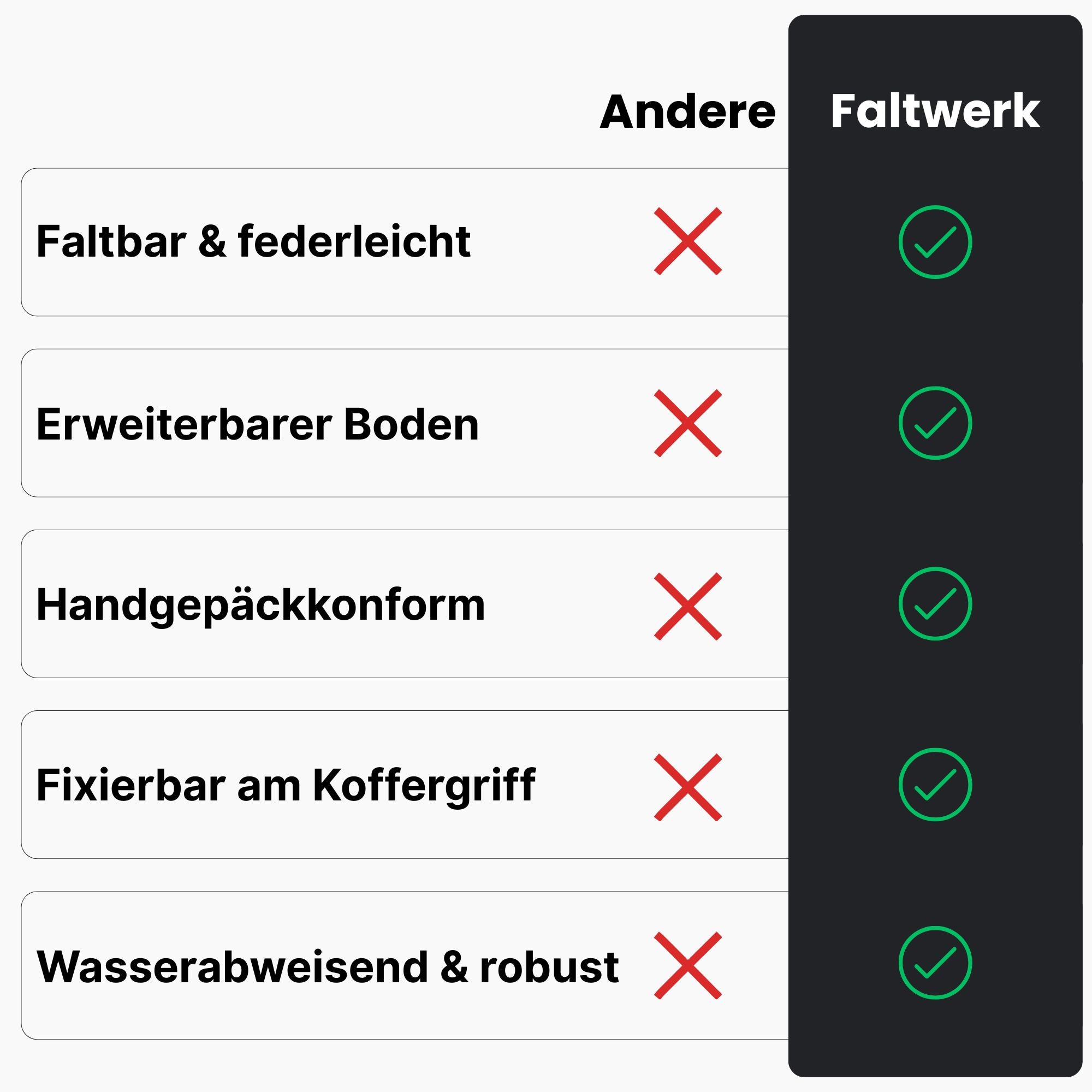 Faltwerk vereint, was andere Taschen nicht schaffen: Handgepäck-konform, wasserabweisend, federleicht und smart im Design.